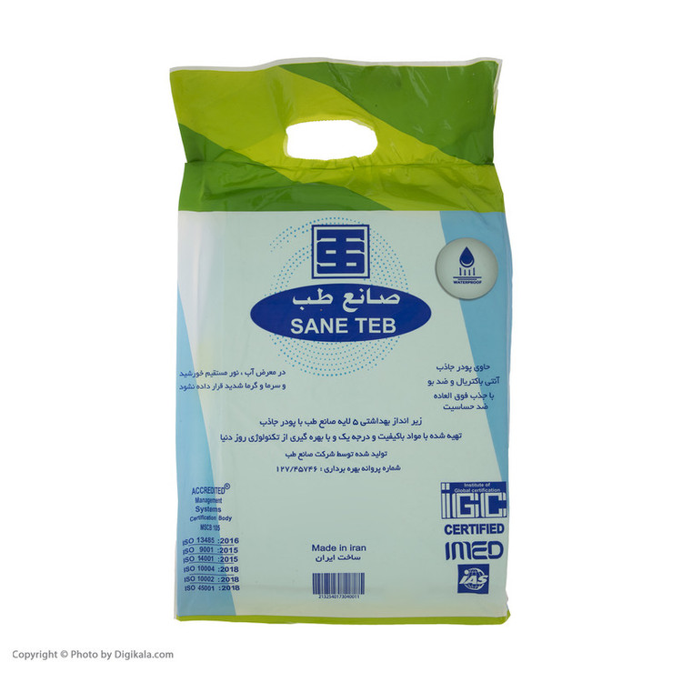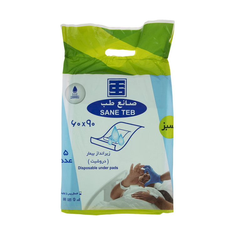 زیر انداز بیمار آنتی باکتریال و ضد بو و حساسیت سایز 60x90 سانتی متر تعداد در بسته 5 عدد با پودر جاذب و قدرت جذب بالا