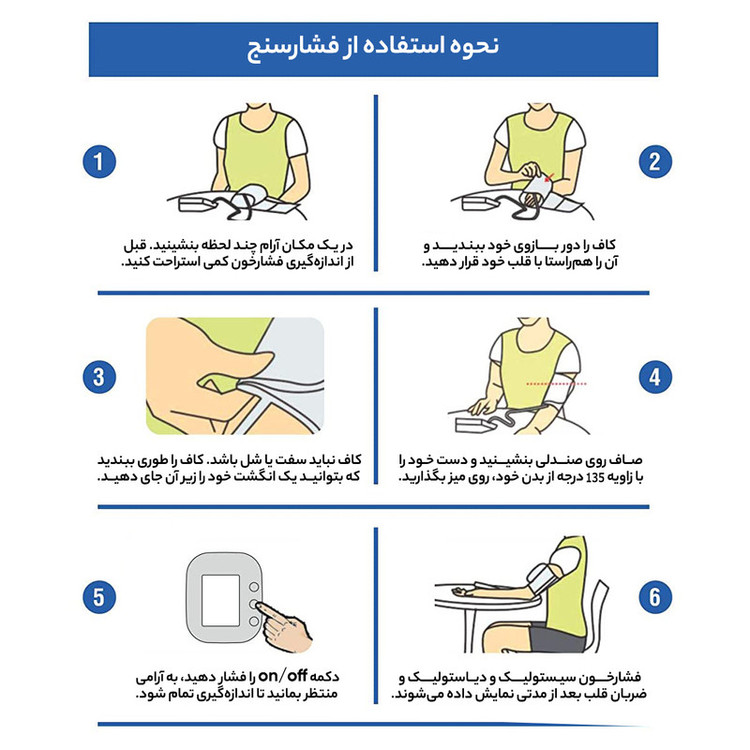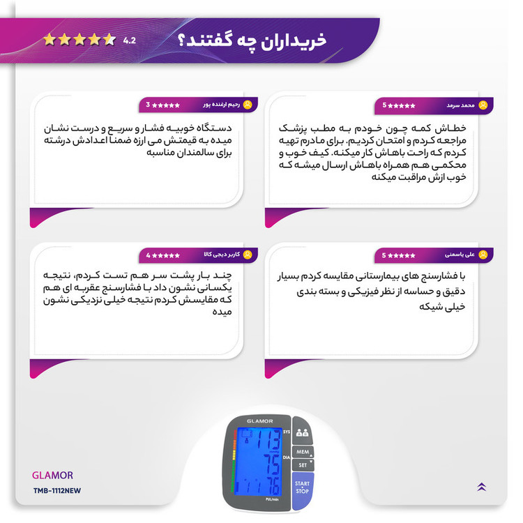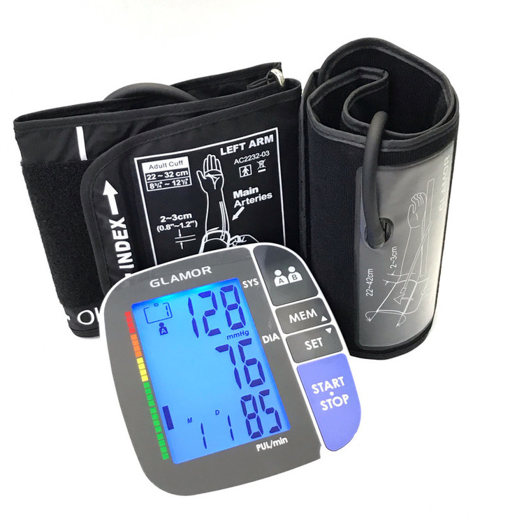 یکی از خطراتی که همیشه سلامتی انسان را تهدید میکند، داشتن فشارخون بالا یا پایین است. گلامور خیال شما را از لحاظ داشتن فشارسنجی بادقت و باکیفیت راحت میکند. فشارسنج دیجیتال گلامور مدل TMB-1112NEW، یک نمونه از تولیدات این برند است که دارای تکنولوژی MWI بوده و از ایجاد فشار باد بیهوده و ایجاد درد در بازو جلوگیری میکند. گلامور یک برند آلمانی است که کاملا از لحاظ دقت و کیفیت در رتبههای اول دنیا قرار دارد. این مدل فشارسنج دارای تاییدیه سازمان جهانی بهداشت (WHO) است و به میزان 250 عدد اندازهگیری برای هر نفر را ذخیره میکند. این فشارسنج دو کاربره بوده و میتواند فشار اندازهگیری شده را در 2 حافظه مختلف ثبت کند. همچنین دارای صفحه نمایش با رنگ آبی است که خواندن اعداد اندازهگیری شده را راحتتر میکند. بازوبند(کاف) دستگاه دو سایز مختلف دارد که هم برای افراد معمولی و هم افراد چاق قابل استفاده است. در داخل دستگاه آداپتور مخصوص وجود دارد که بدون نیاز به باتری هم میتواند کار کند. کاف باید به گونهای روی بازو بسته شود که از خمشدگی آرنج یک یا دو سانتیمتر بالاتر باشد و شلنگ بازوبند به سمت پایین بسته شود. موقع اندازهگیری فشارخون بهتر است که کاربر قبل از آغاز اندازهگیری، سه الی چهار دقیقه نشسته باشد. فشارسنج TMB-1112NEW، سیستم تشخیص آریتمی قلب دارد که در صورت نامنظم بودن ضربان قلب، به کاربر اطلاع میدهد. در داخل صفحه نمایش، خط نواری میزان فشارخون را دارد که با چهار رنگ سبز، زرد، نارنجی و قرمز قابل مشاهده است و با فلش محدوده فشار خون را نیز مشخص میکند. داخل جعبه فشارسنج گلامور، دو عدد بازوبند (فنری و ساده)، کیف ضد ضربه قابل حمل و آداپتور وجود دارد. این دستگاه قابلیت کار با 4 عدد باتری آلکالاین را نیز دارد. این مدل فشارسنج قابل استفاده در منزل، مطب پزشکان و کلینیک است. از ویژگیهای این دستگاه میتوان به اندازهگیری دقیق فشارخون به صورت دیجیتالی، نمایش ضربان قلب، نشانگر میزان مصرف باتری و خاموش شدن خودکار در صورت عدم استفاده نام برد. این دستگاه میزان نبض را از 40 ضربه تا 199 ضربه در دقیقه و میزان فشارخون را از 30 تا 250 میلیمتر جیوه نشان میدهد.