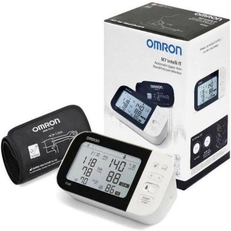 فشارسنج بازویی امرن OMRON مدل M7 یک فشارسنج بازویی تمام اتوماتیک است که مجهز به فناوری Intellisense TM می باشد که باعث می شود شما کاف فشارسنج را به درستی دور بازوهای خود بپیچید.اندازه گیری این دستگاه در کمترین زمان ممکن انجام می شود و می تواند تا 90 حافظه را در خود ثبت و ذخیره کند.این دستگاه اطلاعات را با درج تاریخ و ساعت ثبت و نگه داری می کند.دارای کاف فنری برای سایز بازوهای 22 تا 42 سانتی متر می باشد.فشارسنج دیجیتال بازویی امرن M7 قابلیت محاسبه میانگین را دارد و قابلیت تشخیص آریتمی دارد. تفاوت این دستگاه با مدل M6 در دارا بودن قابلیت اتصال به گوشی های هوشمند از طریق بلوتوث میباشد.