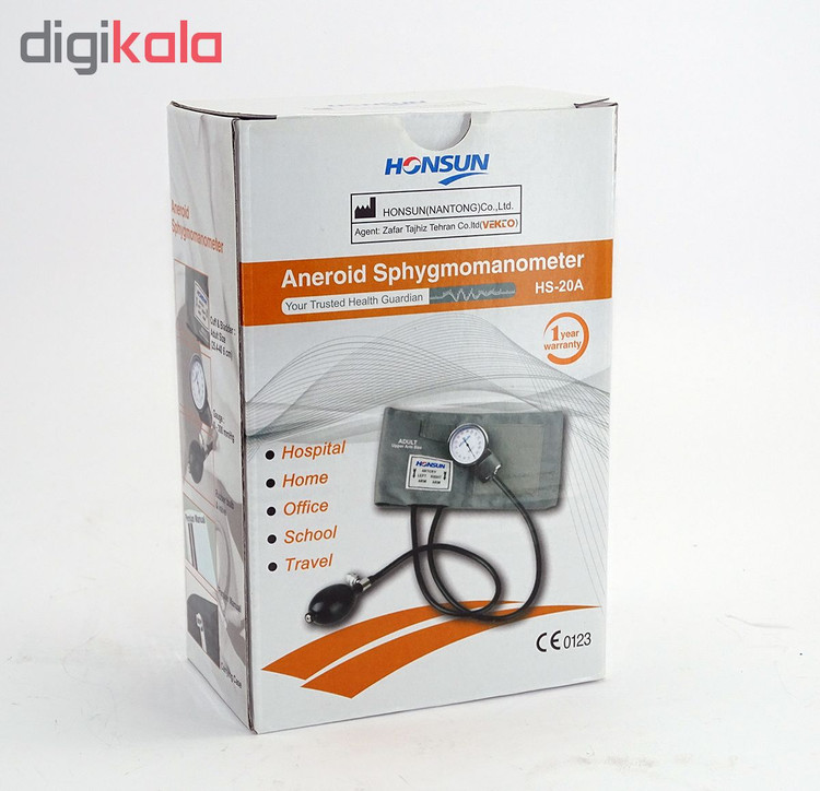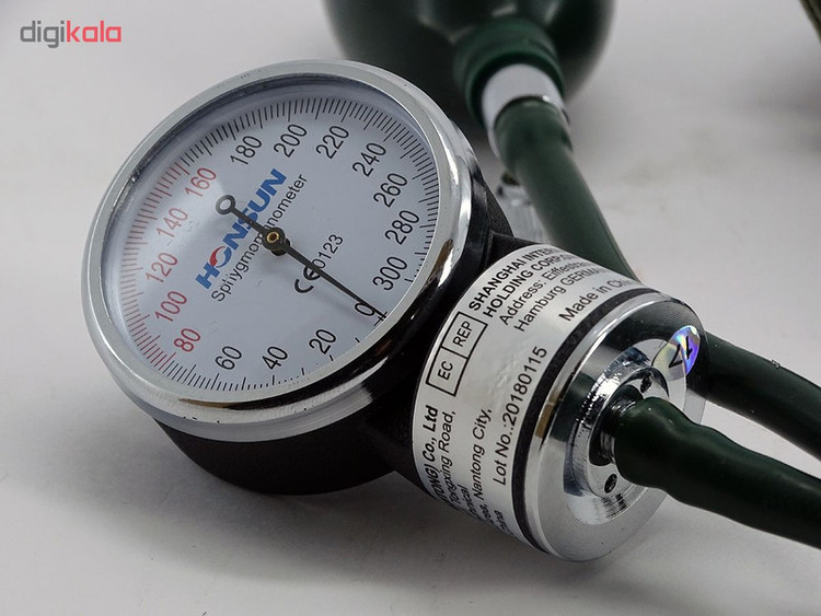 دارای گوشی دو پاویونه بدون نیاز به برق و باتری صفحه نمایش گرد ساعتی مانومتر با زمینه سفید و نوشته های مشکی و قرمز درشت